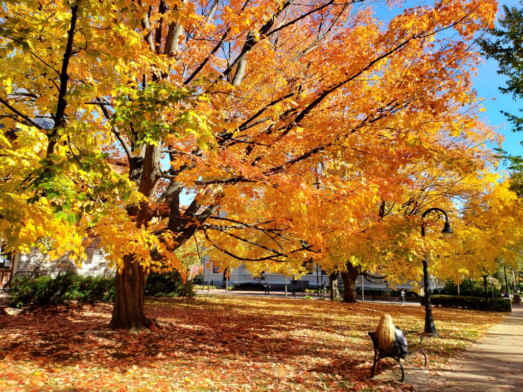 Autumn– leaves of all colors are everywhere. Still on the trees, on the grounds, on the bushes, cars, chairs and benches. I was walking on campus one day, towards one of my favorite spots, surrounded by beautiful trees. Under the old, gorgeous yellow-golden maple, a young woman was sitting on a bench. I couldn’t see her face; all I could see was her long, golden-reddish blond hair. The image was so striking, I wondered what the Universe prepared for me, what message. It immediately felt as though I was there to face my younger self. What would I tell her? What do I know now that I didn’t know then? In a hopelessly trivial fashion, all I could think about was the advice of “stop worrying so much, it’s going to be okay”. Wait, no, it’s going to be much, much better than okay…